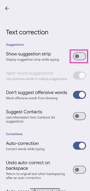 Araç çubuğundaki Ayarlar simgesine basın, metin düzeltmesine gidin ve 'Öneri Şeridi'ni Göster'in yanındaki geçiş anahtarını kapatın.