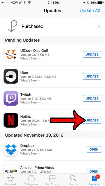 Aşağıdaki adımlar iOS 10.1'de bir iPhone 7 Plus'ta gerçekleştirildi. 30 Kasım 2016 tarihinden itibaren mevcut olan Netflix uygulamasının en güncel sürümünü kullanıyorum. Netflix uygulamasının güncellenmiş sürümünü kullandığınızdan emin olmak için aşağıdaki adımlarda App Store'a gideceğiz.