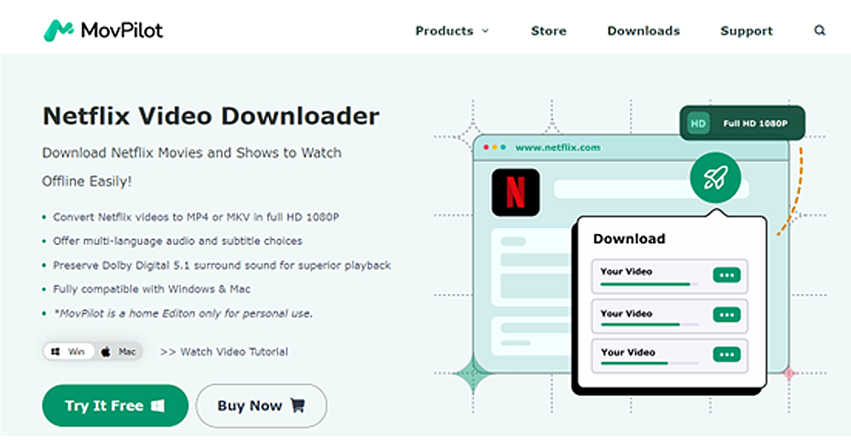 Mac'teki Netflix'ten film indirmenin en güvenilir ve etkili yöntemi doğrudan üçüncü taraf bir indirici kullanmaktır. Burada tavsiye ediyoruzMovpilot netflix video indirici. Bu program, reklam destekli planlarla bile Mac'te herhangi bir Netflix videosunu indirmenize yardımcı olabilir. Ayrıca, Movpilot aracılığıyla indirilen videolar Netflix'in resmi indirme kısıtlamalarını aşabilir. İndirmeler, tercih ettiğiniz cihazlarda herhangi bir yerel oyuncu kullanılarak çalınabilen yaygın video dosyalarıdır.