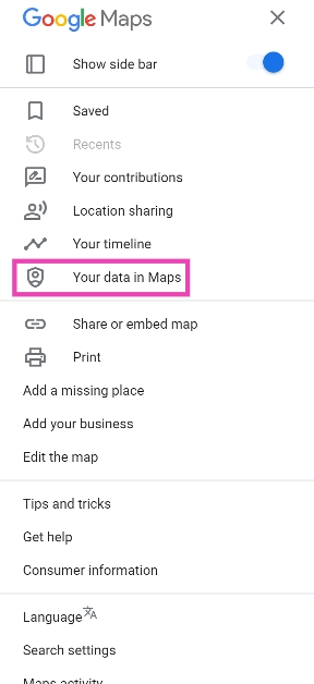 2. Adım:VurmakHamburger menüsüEkranın sol üst köşesinde ve seçinHaritalardaki verileriniz.