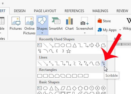 Çekme aracını bulmak biraz zor olabilir, çünkü sadece varsayılan olarak doğrudan “çizim” olarak adlandırılan bir araç yoktur. Şekil araçlarından birini, özellikle şekiller menüsünde bulunan “karalama” aracını kullanmanız gerekir.