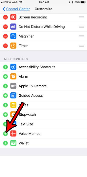 4. Adım: dokunun+solundaki düğmeSesli notlarkontrol merkezine eklemek için. Bunu yalnızca bir kez yapmanız gerektiğini unutmayın. Şu andan itibaren sesli not uygulaması kontrol merkezinde olacak.