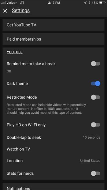 Bu ayarı değiştirmenin, cihazdaki bir tarayıcıda veya masaüstü bilgisayarınızdan YouTube'u ziyaret ettiğinizde YouTube web sitesinin görüntülenmesini etkilemeyeceğini unutmayın. Bu yalnızca iPhone uygulaması için tema ayarını değiştirir. Ve bu tema sadece iPhone'da gerçekten iyi görünmekle kalmıyor, aynı zamanda pil ömrünü geliştirme bonusuna da sahip!