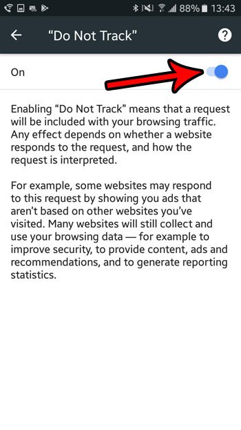 Adım 5: Ayarı açmak için ekranın sağ üst kısmındaki düğmeye dokunun. Bu ayarın web siteleri tarafından nasıl kullanıldığını ve yorumlandığını anlayabilmeniz için bu sayfadaki her şeyi de okumak iyi bir fikirdir.