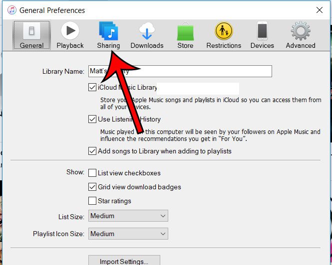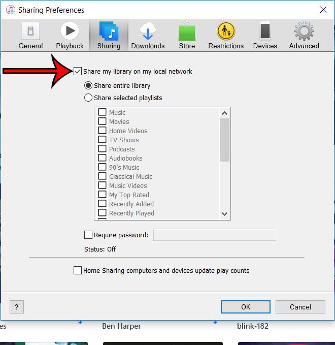 4. Adım: Kutuyu solundaki kutuyu kontrol edinKütüphanemi yerel ağımda paylaşın. Hangi çalma listelerinin paylaşıldığını da yapılandırabileceğinizi ve bir şifre oluşturabileceğinizi ve değişiklikleri paylaşmanın Play Nato Cants olup olmadığına karar verebileceğinizi unutmayın. İşiniz bittikten sonraTAMAMPencerenin altındaki düğme.
