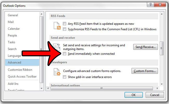 Adım 5: aşağı doğru kaydırınGönder ve AlMenünün bölümü, ardından solundaki kutuyu tıklayınBağlandığında hemen gönderinonay işaretini kaldırmak için. Otomatik Gönder ve Al seçeneğini de kapatmak istiyorsanız, aşağıdaki adımlara devam edin.