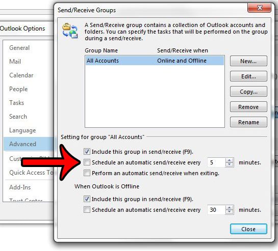 Adım 7: Soldaki kutuyu tıklayınOtomatik bir gönderin/al.onay işaretini kaldırmak için. Sonra tıklayabilirsinizKapalıPencerenin altındaki düğme, ardındanTAMAMaltındaki düğmeOutlook Seçenekleripencere.