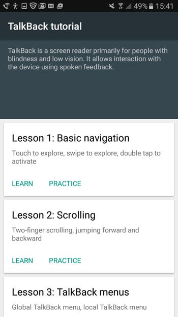 Aşağıdaki adımları kullanarak Talkback modunu etkinleştirdikten sonra, telefonunuzla etkileşim kurma şekliniz biraz değişecektir. Talkback aktivasyonunun hemen ardından çok sayıda yararlı bilgi sağlayan bir eğitim var.