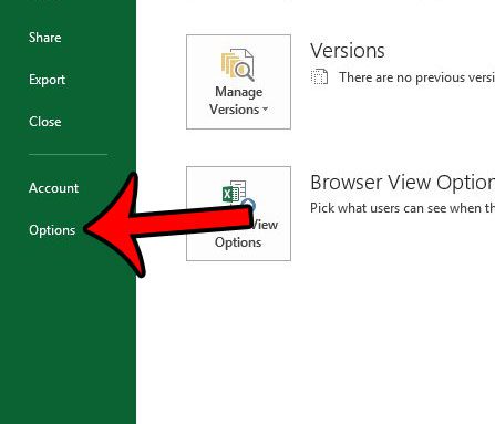 Adım 3: TıklayınSeçeneklerpencerenin sol tarafındaki sütunun altındaki. Bu başlıklı bir pencere açarExcel Seçenekleri.