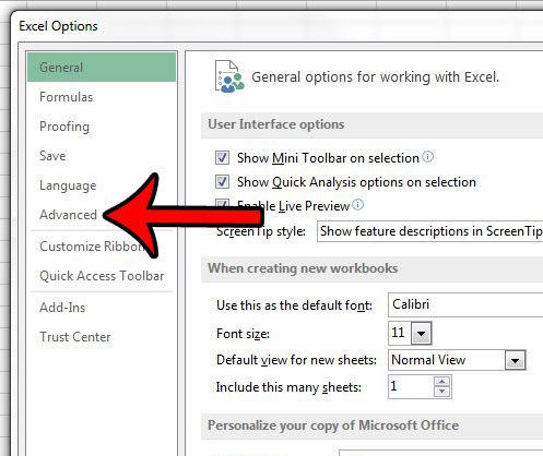 4. Adım: tıklayınGelişmişsol tarafındaki sütunda düğmeExcel Seçenekleripencere.