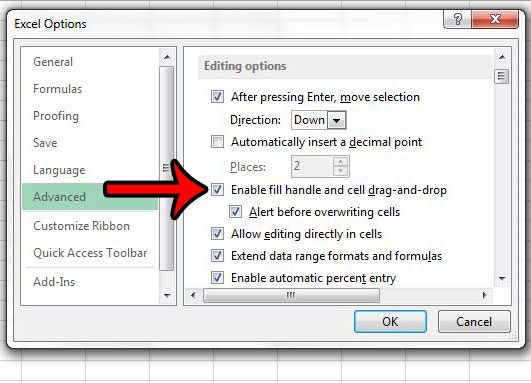 Ancak Excel 2013'teki doldurma kolu seçeneği açılabilir veya kapatılabilir, böylece beklediğiniz gibi çalışmadığını görebilirsiniz. Aşağıdaki kılavuzumuz, tekrar açıp bu çok kullanışlı özellikten yararlanmaya başlayabilmeniz için doldurma sapı ayarına işaret edecektir.