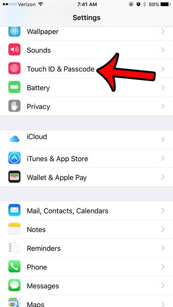 2. Adım: Aşağı kaydırın ve dokununDokunma Kimliği ve Parolaseçenek.