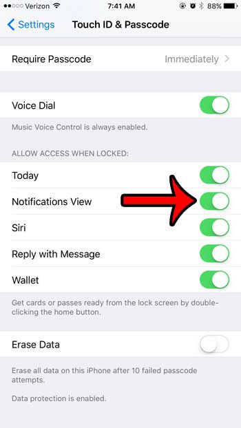 4. Adım: aşağı doğru kaydırınKilitlendiğinde erişime izin verinMenünün bölümü, ardından sağdaki düğmeye dokununBildirimler Görünümaçmak için. Düğmenin etrafında yeşil gölgeleme olduğunda bunun açıldığını bileceksiniz. Aşağıdaki resimde açılmıştır.