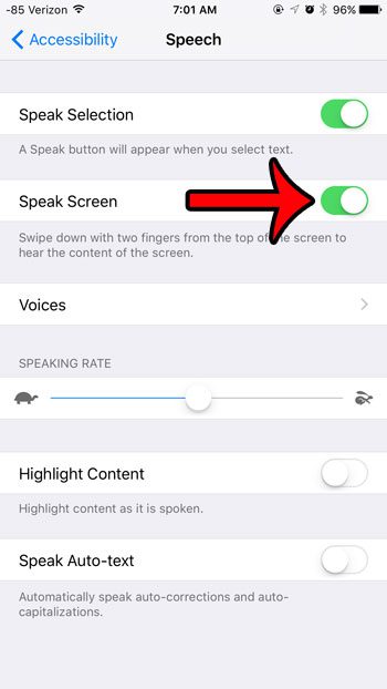 - Sağdaki düğmeye dokununKonuş Ekranıaçmak için. Düğmenin etrafında yeşil gölgeleme olduğunda seçenek açılır. "Konuş ekranı" ayarı aşağıdaki resimde açılır. Bu menüde tercihlerinize uyacak şekilde ayarlayabileceğiniz ses ve konuşma oranı için de seçenekler olduğunu unutmayın.