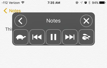 “Sizin ekranı” seçeneğini kullanmak için ekranınızın üstünden iki parmağınızla aşağı kaydırın. İPhone'unuz daha sonra ekranın içeriğini okumaya başlayacak, ayrıca konuşmanın hızını değiştirmek, konuşmayı duraklatma, konuşmayı kapatma ve öğeler arasında gezinme seçenekleri içeren gri bir araç kutusu görüntüleyecek.