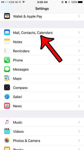 2. Adım: Aşağı kaydırın ve dokununPosta, Kişiler, Takvimlerseçenek.