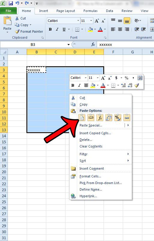 - Adım 2: Kopyalanan değeri yapıştırmak istediğiniz hücre grubunu seçin, ardından seçimin içine sağ tıklayın, ardından tıklayın.MacunAltında DüğmeSeçenekleri Yapıştır. Alternatif olarak, basabilirsinizCtrl + VHücre grubunu seçtikten sonra hücre değerini yapıştırmak için klavyenizde.