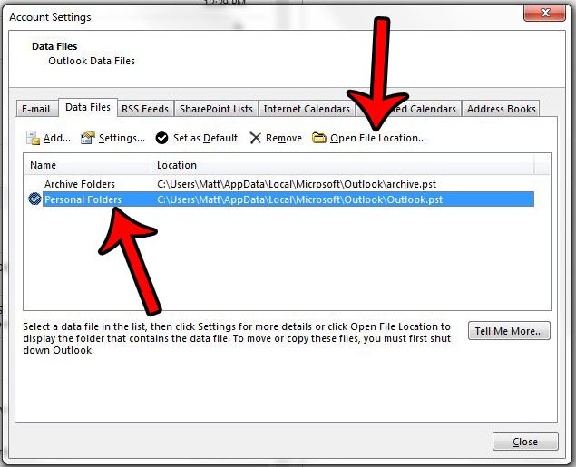 Adım 5: TıklayınKişisel KlasörlerSeçenek Bir kez seçmek için, ardındanDosya Konumu AçDoğrudan .pst dosyanızı içeren klasöre gitmek için düğme.