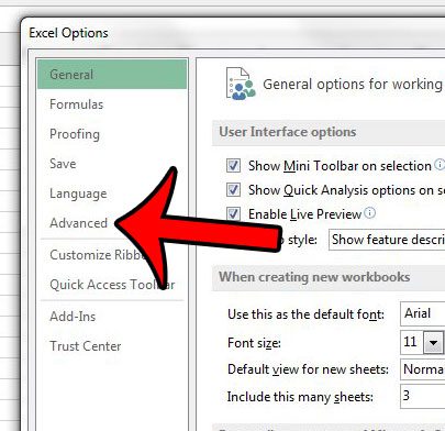 3. Adım: tıklayınGelişmişSekme sol tarafındaExcel Seçenekleripencere.
