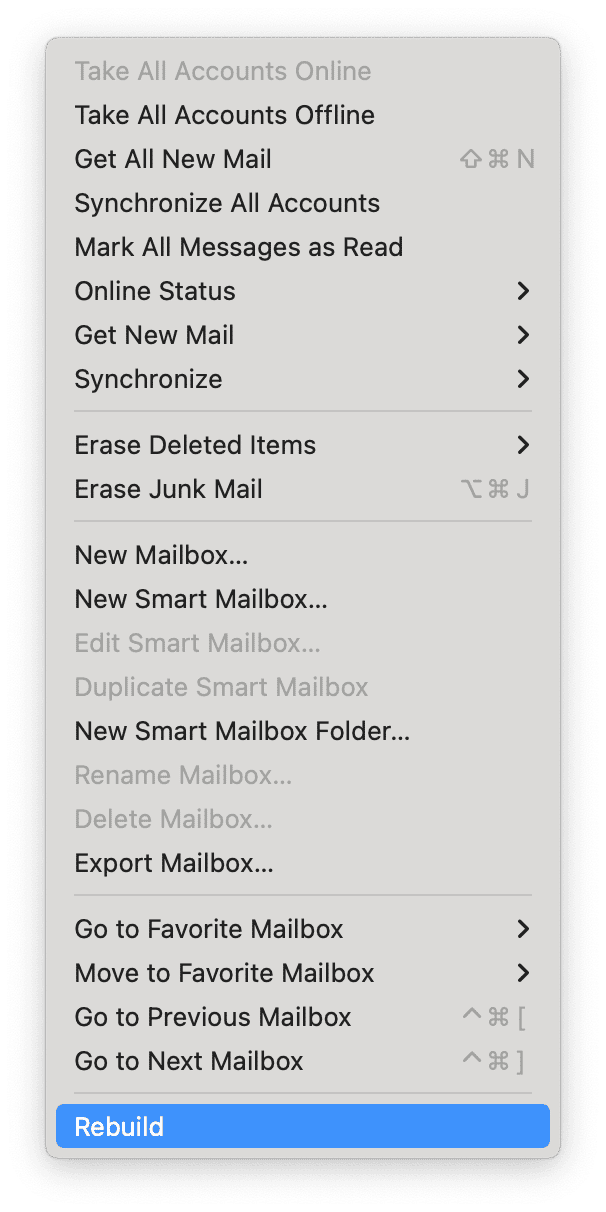 Posta olarak, kenar çubuğundaki Birleşik Gelen Kutusunu seçin. Ardından, Posta Kutusu menüsünü tıklayın ve yeniden oluşturmayı seçin. Bu, posta mesajlarının dizinini yeniden oluşturur ve bazen arama ile ilgili sorunları çözebilir.
