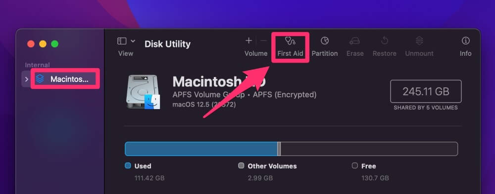 TıklayınDisk yardımcı programı. Sabit sürücüyü tıklayın. Tıklamakİlk yardım.