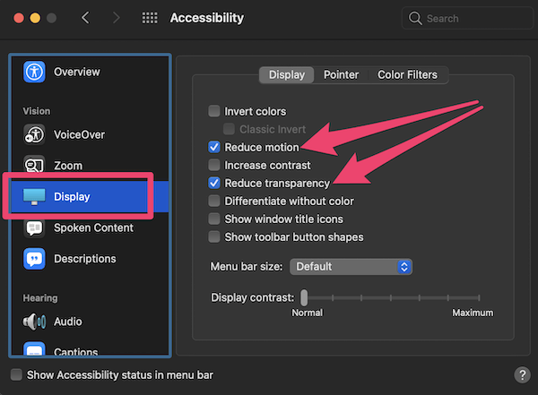 2. Adım: TıklayınGörüntülemekSol taraf menüsünde ve ardından şunu söyleyen onay kutularını kontrol edinŞeffaflığı azaltınVeHareketi azaltmak.