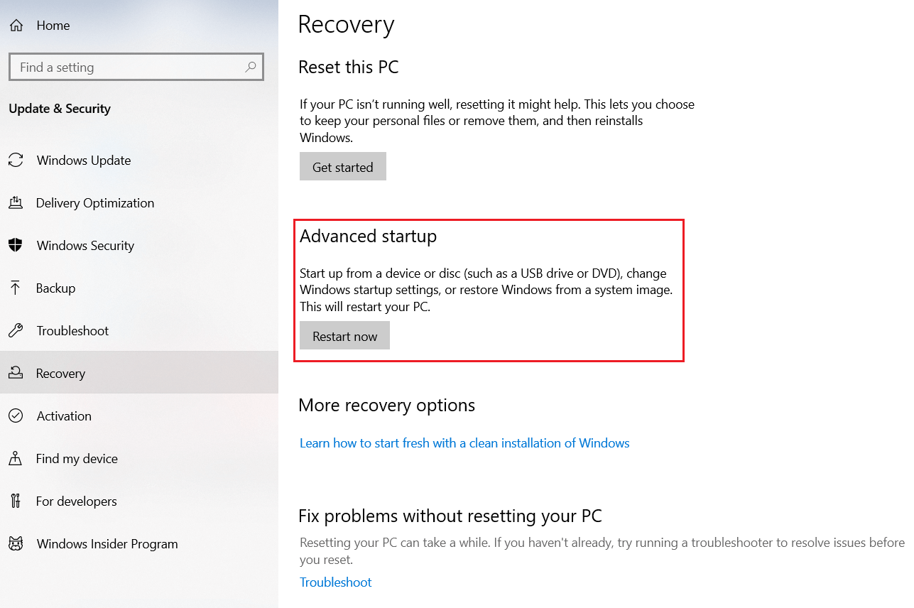 2. Adım:Solda Kurtarma'yı tıklayın. Gelişmiş başlangıçta yeniden başlatmayı şimdi tıklayın.