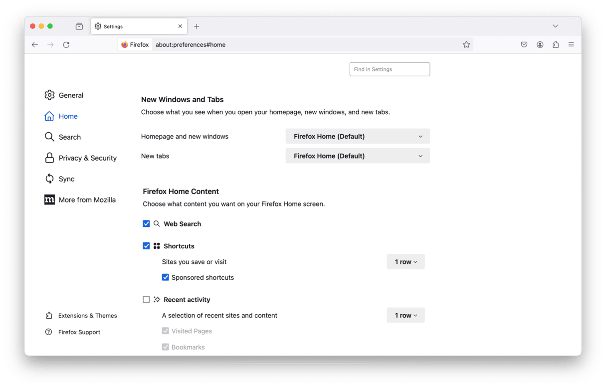 Tarayıcı ayarlarını kontrol etmek için Firefox'taki ev ve arama ayarları bölümlerine gidin.