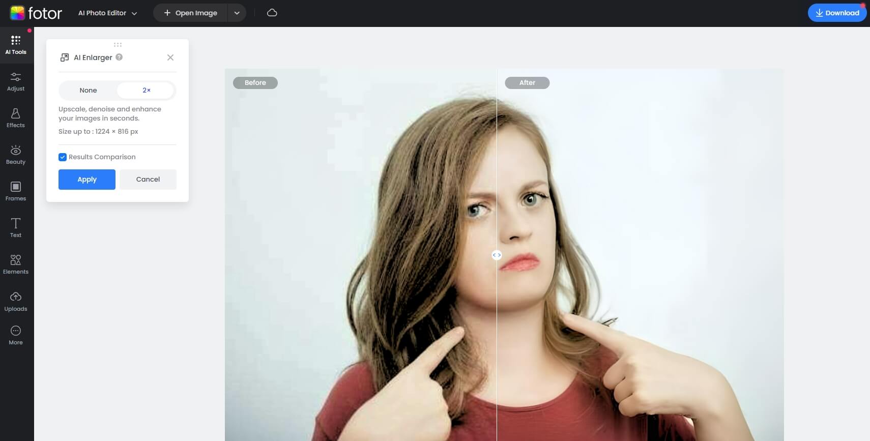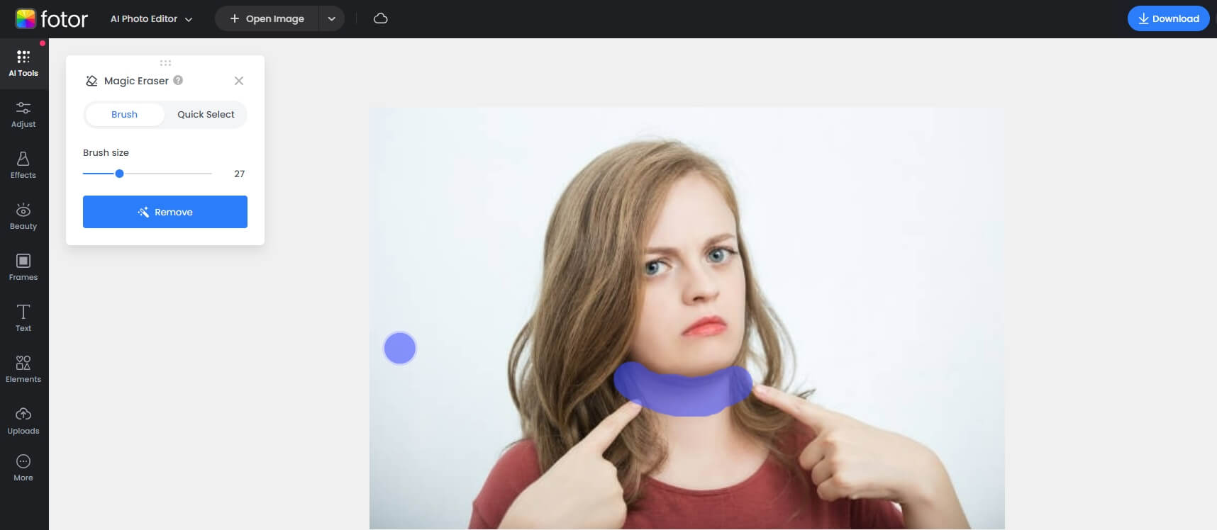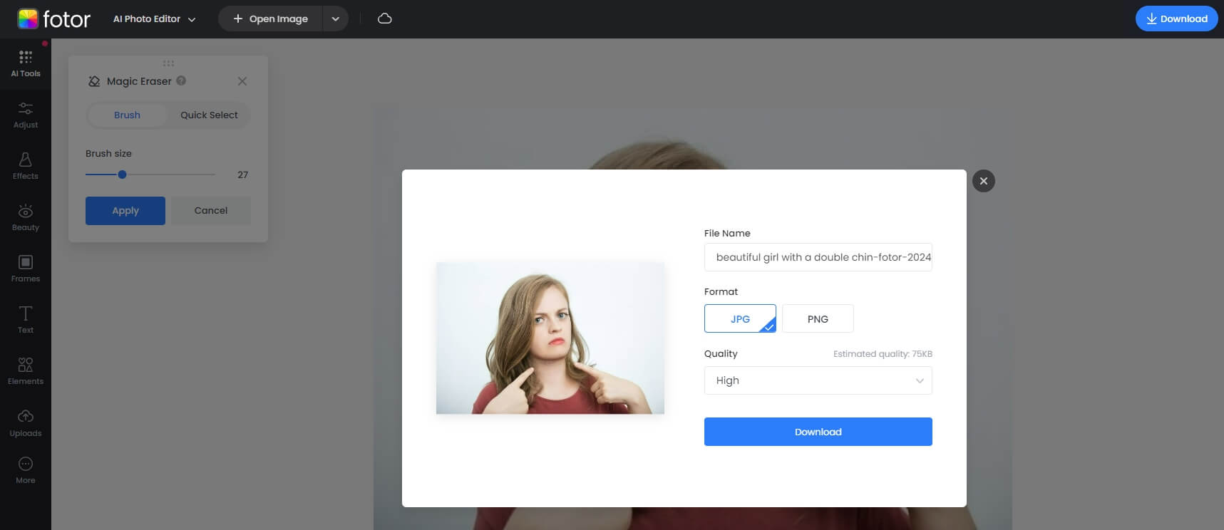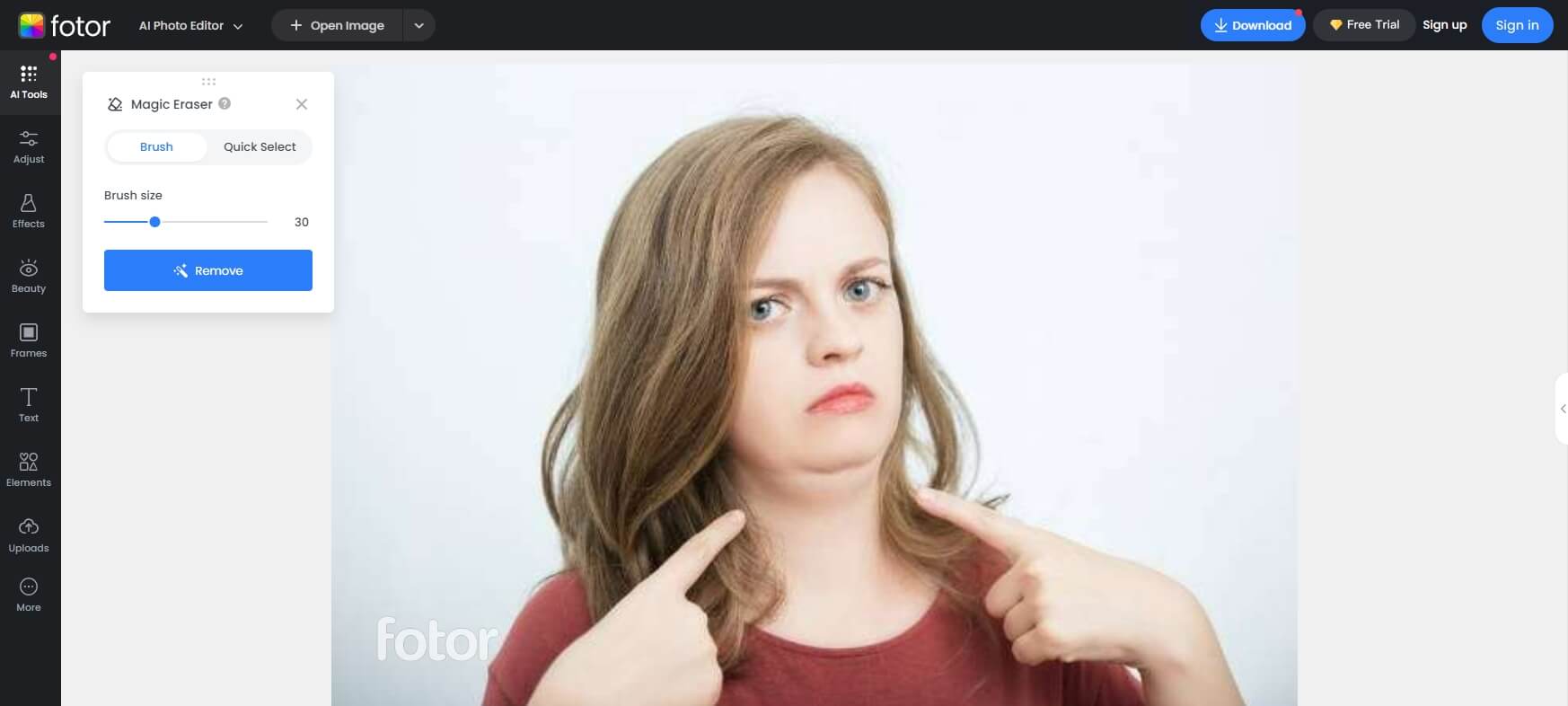 Fotor, mükemmel bir seçenektir, çünkü saniyeler içinde fotoğraflardan çift çeneleri hızlı bir şekilde ortadan kaldırmak için tasarlanmış bir Sihirli Silgi AI aracı ile hepsi bir arada bir yüz editörü sunuyor!
