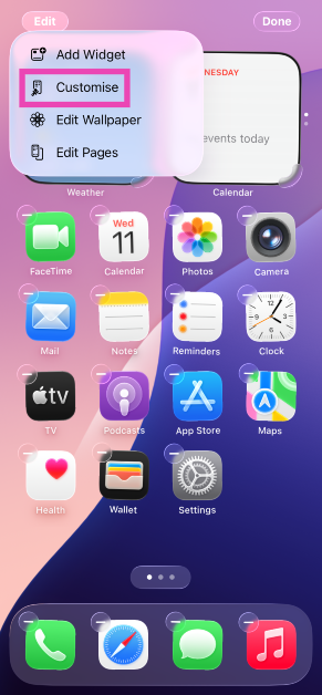İPhone'unuz iOS 26 olarak güncellendikten sonra, ana ekranda boş bir noktaya dokunun, ekranın sağ üst köşesindeki 'Düzenle' düğmesine basın ve 'Özelleştir' seçin. Seçenekler listesinden 'temizleyin' seçin ve bir ekran teması seçin.