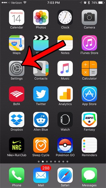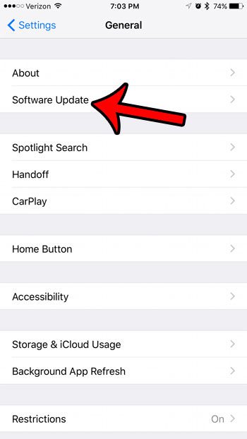 Aşağıdaki adımlar, iPhone 7 için iOS 10.2 güncellemesini nerede bulacağınızı ve yükleyeceğinizi gösterecektir. Bu güncellemenin neredeyse 400 MB boyutunda olduğunu unutmayın, bu nedenle cihazınızda biraz boş alan olması gerekir. Mevcut alanı artırmak için cihazınızdan kaldırabileceğiniz öğeler için iPhone'unuzdan öğeleri silmek için tam kılavuzumuzu okuyun.