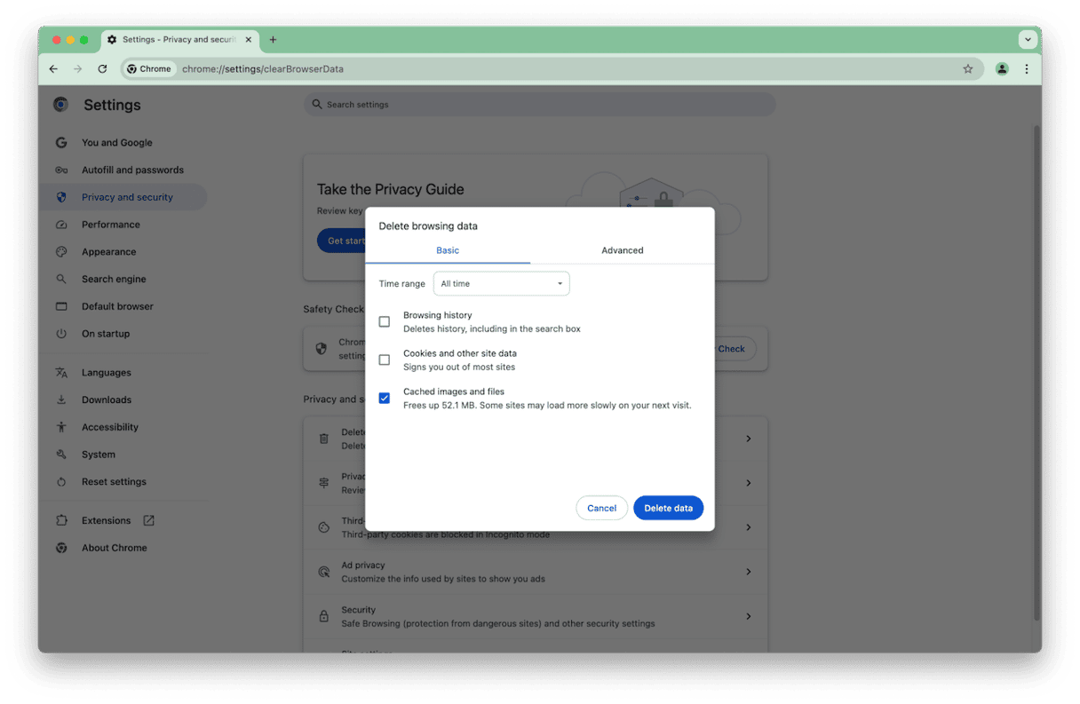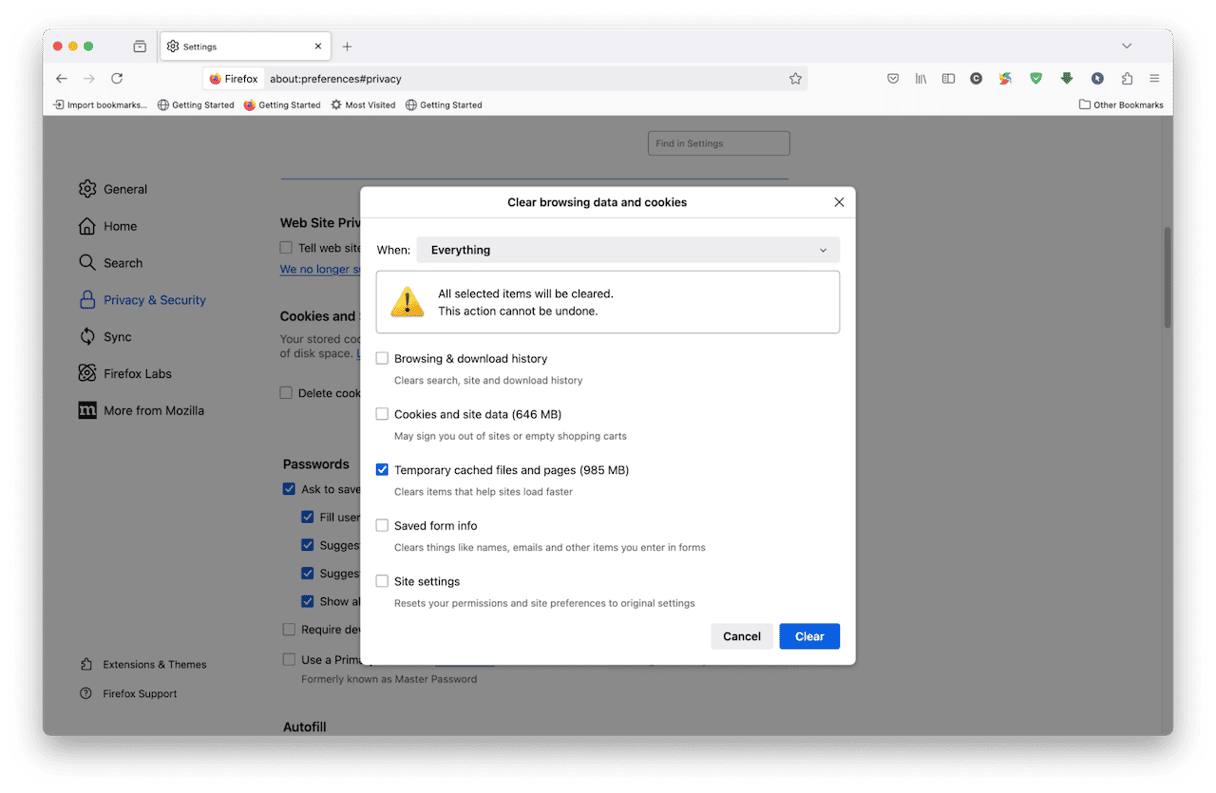 - Geçici önbelleğe alınmış dosyalar ve sayfalar olarak etiketlenmiş onay kutusunu seçin ve Clear'ı tıklatın.