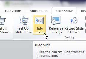 TıklayınGizle Slideiçindeki düğmeKurmakŞeridin bölümü. Ayrıca, slaytta sağ tıklayarak bir slaytı gizleyerek, ardından kısayol menüsünün altındaki slayt seçeneğini seçebilirsiniz.