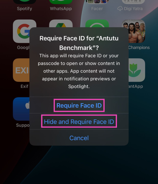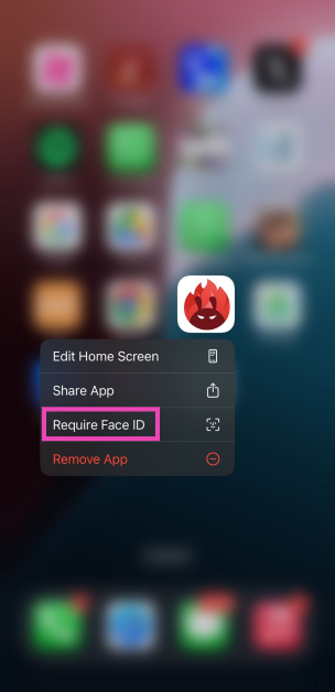 Uygulamanın simgesine ana ekranda uzun basın ve açılır menüden Yüz Kimliği gerektirmeyi seçin. Kilitlemek için 'Yüz Kimliği Gereksinimine' veya gizlemek için 'Giz ve Yüz Kimliği İsteyin' üzerine dokunun.