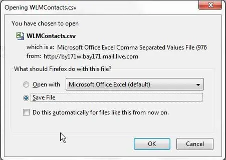 Adım 3: Bu, otomatik olarak Hotmail kişilerinizin bir CSV dosyasını oluşturur, bu da dosyayı bilgisayarınızdan kaydetmenizi veya açmanızı ister. Dosyayı bilgisayarınıza kaydetme seçeneğini seçin.