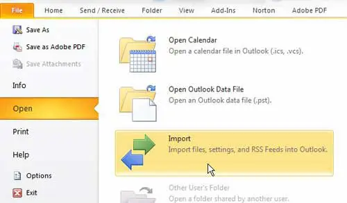 Adım 5: Portakal'ı tıklayınDosyaPencerenin sol üst köşesindeki sekme, tıklayınAçıkPencerenin sol tarafında, ardındanİçe aktarmakMicrosoft Outlook 2010'ları başlatmak için düğmeİhracat Sihirbazı İçe Aktar.