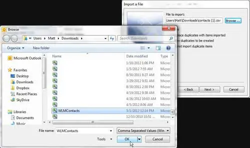 Adım 8: tıklayınGöz atmakBir sonraki pencerenin üst kısmındaki düğme, ardından daha önce Hotmail'den dışa aktardığınız dosyayı bulun. Seçmek için dosyayı bir kez tıklayın, ardındanTAMAMdüğme.