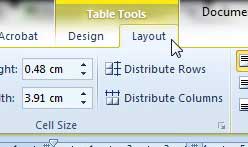 Tablo boyutunu belirtinİmleciniz masanın içine yerleştirildiğinde, pencerenin üstünde iki yeni sekme olduğunu fark edeceksiniz. Altında konumlandırılırlarMasa araçlarıseçenek ve olarak etiketlenirTasarımVeDüzen.