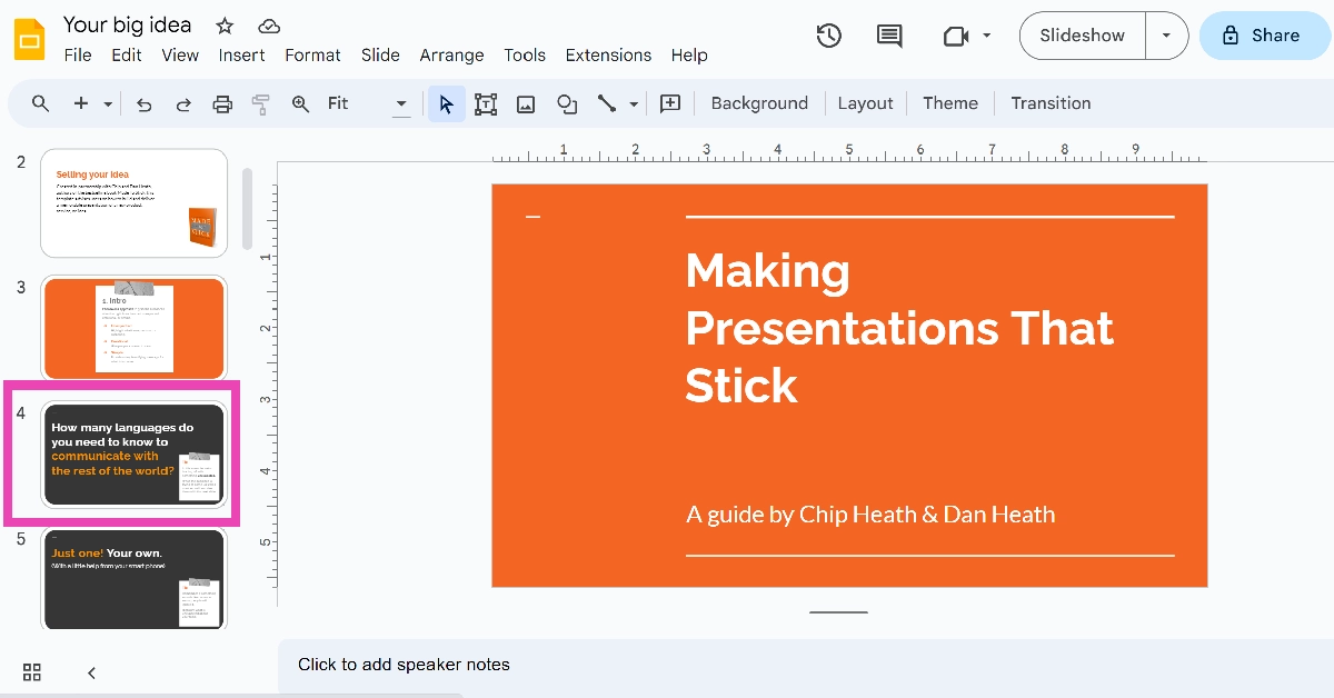 2. Adım:Yan menüyü kullanıngezmekSlayt için Google Doc'unuza eklemek istediğiniz.