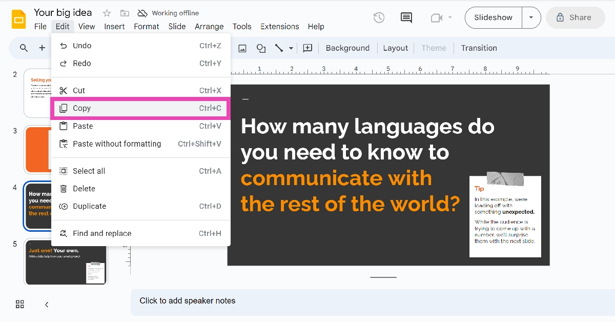 Google slaytlarına gidin ve belgeye gömmek istediğiniz slaytı seçin. SeçmeDüzenle> Kopyalasonra belgeyi açın ve ilgili noktaya yapıştırın.