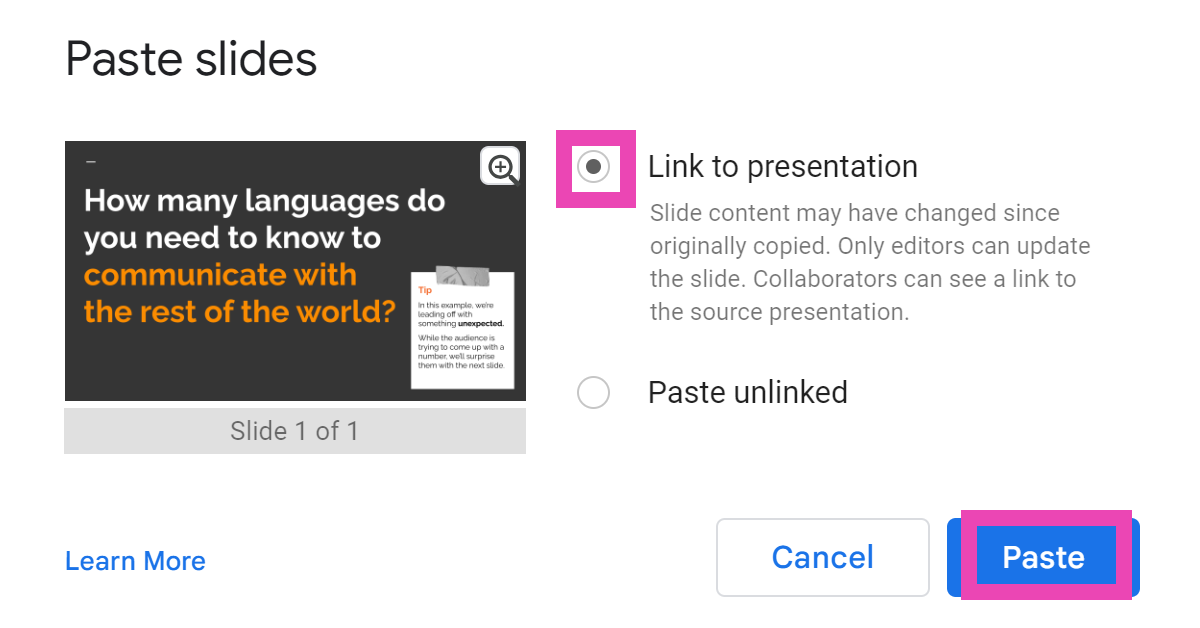 Sunumunuzda daha sonra değişiklik yapmayı planlıyorsanız, slaytını ona bağladığınızdan emin olun.. Bu seçenek, slaytı belgeye yapıştırdığınızda bir açılır kutuda size verilecektir. Sunuma yapılan değişiklikler daha sonra güncellediğiniz anda gömülü slayt üzerine yansıtılacaktır. İşbirlikçiler kaynak sunumun bağlantısını görebilirken slaytları yalnızca editörler güncelleyebilir.