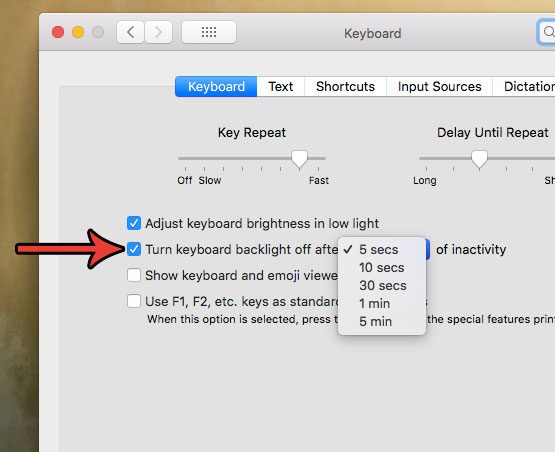 Adım 3: Solundaki kutuyu kontrol edinKlavye arka ışığını sonra kapatın, ardından açılır menüyü tıklayın ve daha sonra klavye arka ışığınızın kapatılmasını istediğiniz hareketsizlik süresini seçin.