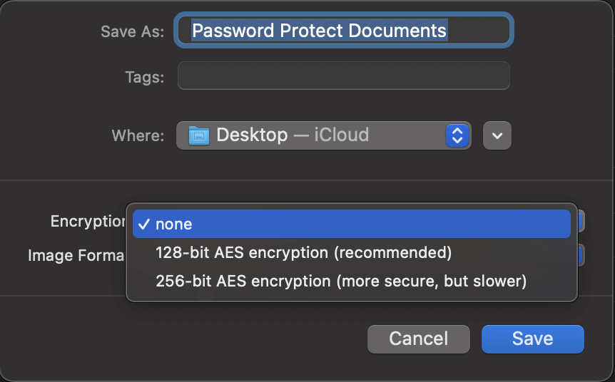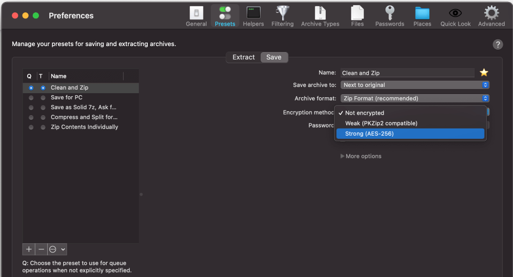 Sadece uygulamayı indirin ve yükleyin veBetterZip Tercihleri. İçindeKaydetmek sekme, farklı seviyelerde şifreleme için seçenekleri özelleştirebilirsiniz.