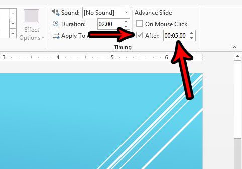Adım 7: Soldaki kutuyu tıklayınFare Tıklamasındaonay işaretini kaldırmak için, ardındanSonrasındave her slaydın görüntülenmesini istediğiniz süreyi belirtin.