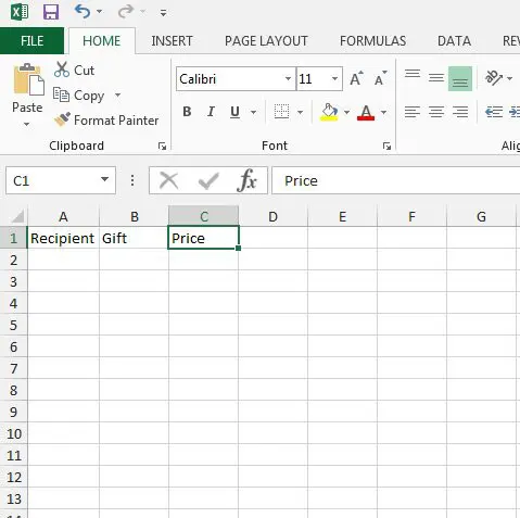 Adım 2: Hücre A1'i tıklayın, “Alıcı” yazın, B1 hücresine tıklayın, “Hediye” yazın, ardından C1 hücresinin içine tıklayın ve “Fiyat” yazın.