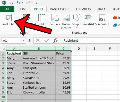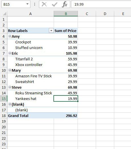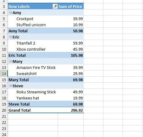 Benim çözümüm, daha sonra bir pivot tablosu kullanarak özetlediğim üç sütunlu bir e-tablo. Pivot tablosu, verileri, o kişi için satın alınan öğelerin bir listesi ve bölümün altındaki bir subtotal ile her bir kişi için bir bölüme düzenleyecektir. Pivot tablosu otomatik olarak yenilenebilir, böylece hediyelerin eklendiği sipariş hakkında endişelenmenize gerek kalmadan, satın alma işlemi yaparken listeye öğe eklemeye devam edebilirsiniz.
