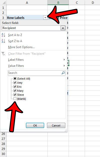 Örneğin, “boş” seçeneğini tablodan kaldırmak istiyorsanız, sağdaki oku tıklayabilirsiniz.Satır etiketleri, boşluğun solundaki kutuyu işaretleyin, ardından tıklayın.TAMAMdüğme.