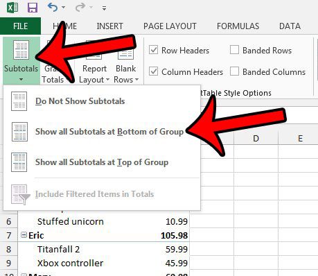 Bunu tıklayarak yapınTasarımpencerenin üst kısmındaki sekme,Subtotalsiçindeki düğmeDüzenŞeridin bölümü, ardındanGrubun dibindeki tüm alt toplamları gösterinseçenek.