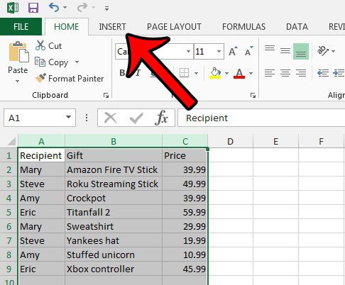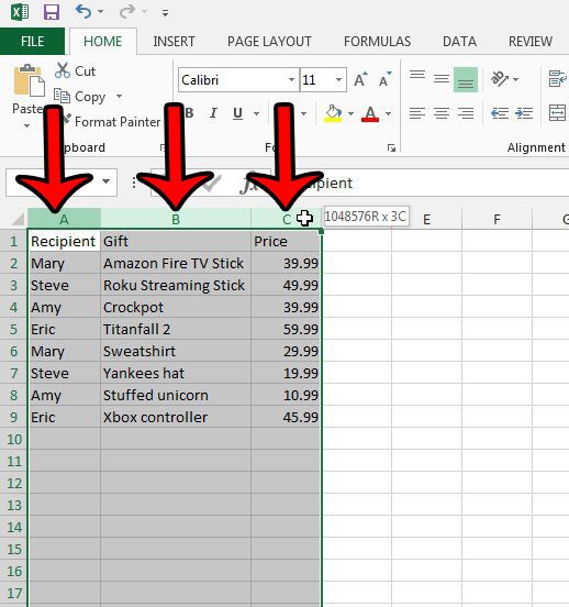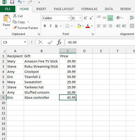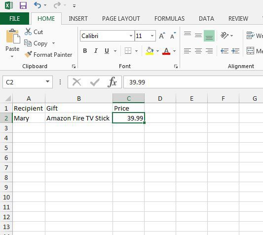 Örneğin, varsaAmazon Fire TV Stick (Amazon Link)Mary adında biri için, A2 hücresine “Mary”, B2 hücresine “Amazon Fire TV çubuğu” ve C2 hücresine “39.99” girebilirsiniz.