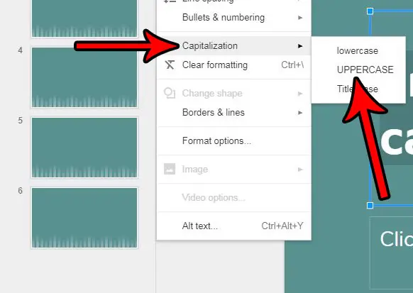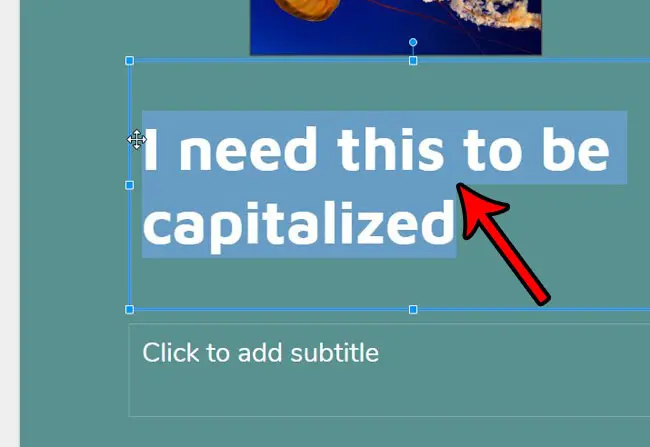 Bu sorunu çözmenin bir yolu, bu metne biçimlendirme uygulamaktır. Bu renk veya yeni bir yazı tipi şeklinde olabilir veya tüm metin büyük harf yapmayı seçebilirsiniz. Ancak çok fazla metin varsa, hepsini yeniden yazmamayı tercih edebilirsiniz. Neyse ki, Google slaytlarında tüm metninizi büyük harfe dönüştürecek bir büyük harf oluşturma biçimlendirme seçeneği kullanabilirsiniz.